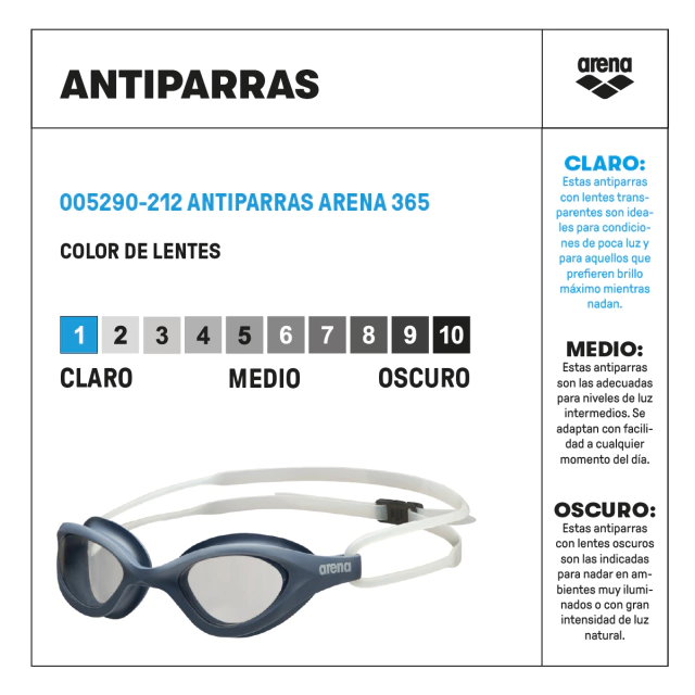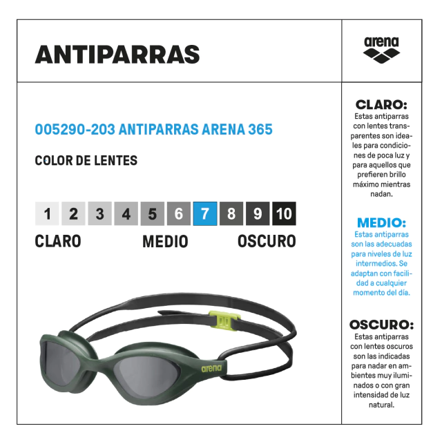 Desarrollada especialmente para natación recreativa, las antiparras arena 365 cuentan con diversas opciones de color y tipo de lentes, desde transparentes hasta ahumadas. Están fabricadas con materiales altamente resistentes, para expresar tu pasión por la natación durante muchas temporadas.