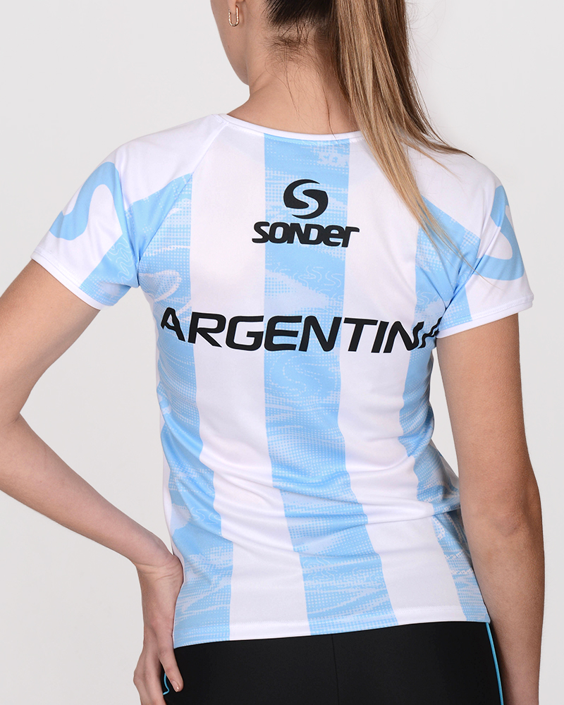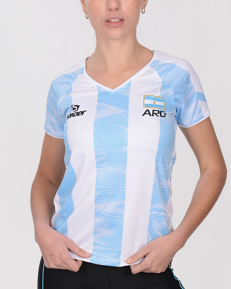 Remera clásica con escote en V de poliéster sublimado Duna Arg. Nuevo modelo bastonado.