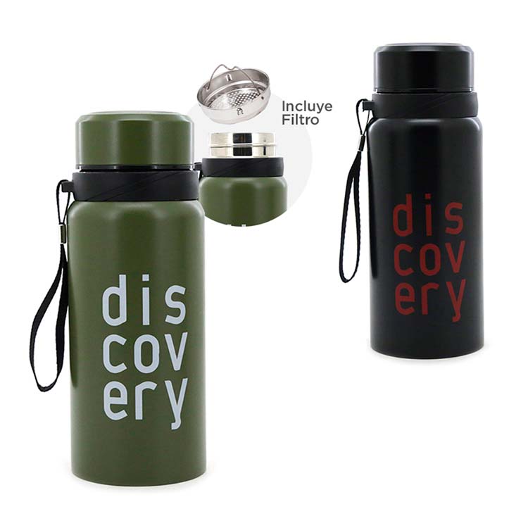 Termo doble capa de acero inoxidable Discovery Adventures. Material: capa Interna 100% acero inoxidable AISI304L y capa externa 100% acero inoxidable AISI201. Tapa a rosca y filtro ambos 100% de acero inoxidable AISI304L. Capacidad 600 ml, dimensiones totales alto 21 cm, diámetro 8 cm.