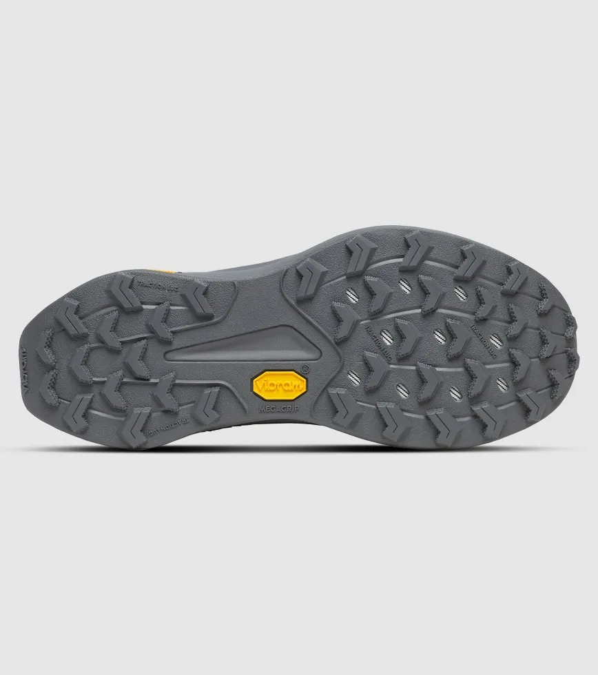La parte superior de malla reciclada se ha actualizado para ofrecer mayor resistencia a la abrasión y, al mismo tiempo, mantener una excelente transpirabilidad. Una puntera reforzada añade protección adicional. La entresuela de EVA PWRRUN, enriquecida con un 16 % más de espuma y una membrana Rock Plate en el antepié, proporciona una amortiguación óptima, un retorno de energía más efectivo y protección contra rocas y clavos. La suela exterior, completamente renovada, incorpora una banda de rodadura Vibram Megagrip que ofrece un agarre excepcional en cualquier terreno y en todas las condiciones, mientras que los tacos invertidos promueven una tracción óptima tanto en subida como en bajada.
